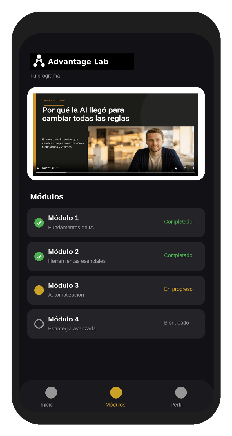 Lecciones cortas diseñadas para personas ocupadas. Sin teoría innecesaria — cada módulo termina con una acción concreta que implementas de inmediato y ves resultados desde el primer día.